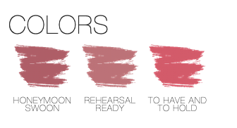 A selection for the bride of 2 long lasting colors for rehearsal dinner and wedding day and a soft gloss to wear while enjoying honeymoon!